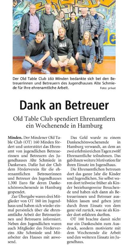 OT 160 Minden ist kein Service-Club. Trotzdem unterstützen wir immer wieder gerne Menschen in Not und helfen dort vor Ort, wo Hilfe benötigt wird. Entweder setzt OT160 eigene Projekte um oder gemeinsam mit Round Table 160 Minden.